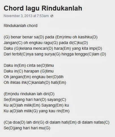 Berikut ini lirik lagu "Hilang" dari Deva Andiwi. Jauh sudah harapan bagiku 'Tuk mengulang lagi waktu yang berlalu Seadanya bisa ku merubah Semua yang terjadi kurasa sendiri Kuharap semua ini hanya mimpi Kuingin terbangun dan semua kembali Atau ku hilang pergi dan menjauh Sirna bagaikan tak berarti Hilang bagai debu Kuharap semua ini hanya mimpi Berikut kunci (chord) gitar dan lirik lagu Rehat yang populer dinyanyikan Kunto Aji. Berikut kunci (chord) gitar dan lirik lagu Rehat yang populer dinyanyikan Kunto Aji.. Semua ini bukan salahmu Bm7 Em7 Jangan berhenti A7 Yang kau takutkan. Takkan terjadi. Bm7 Bb7 Em7 Yang dicari hilang Bm7 Bb7 E7 Yang dikejar lari. Dmaj7 Yang ditunggu F#.